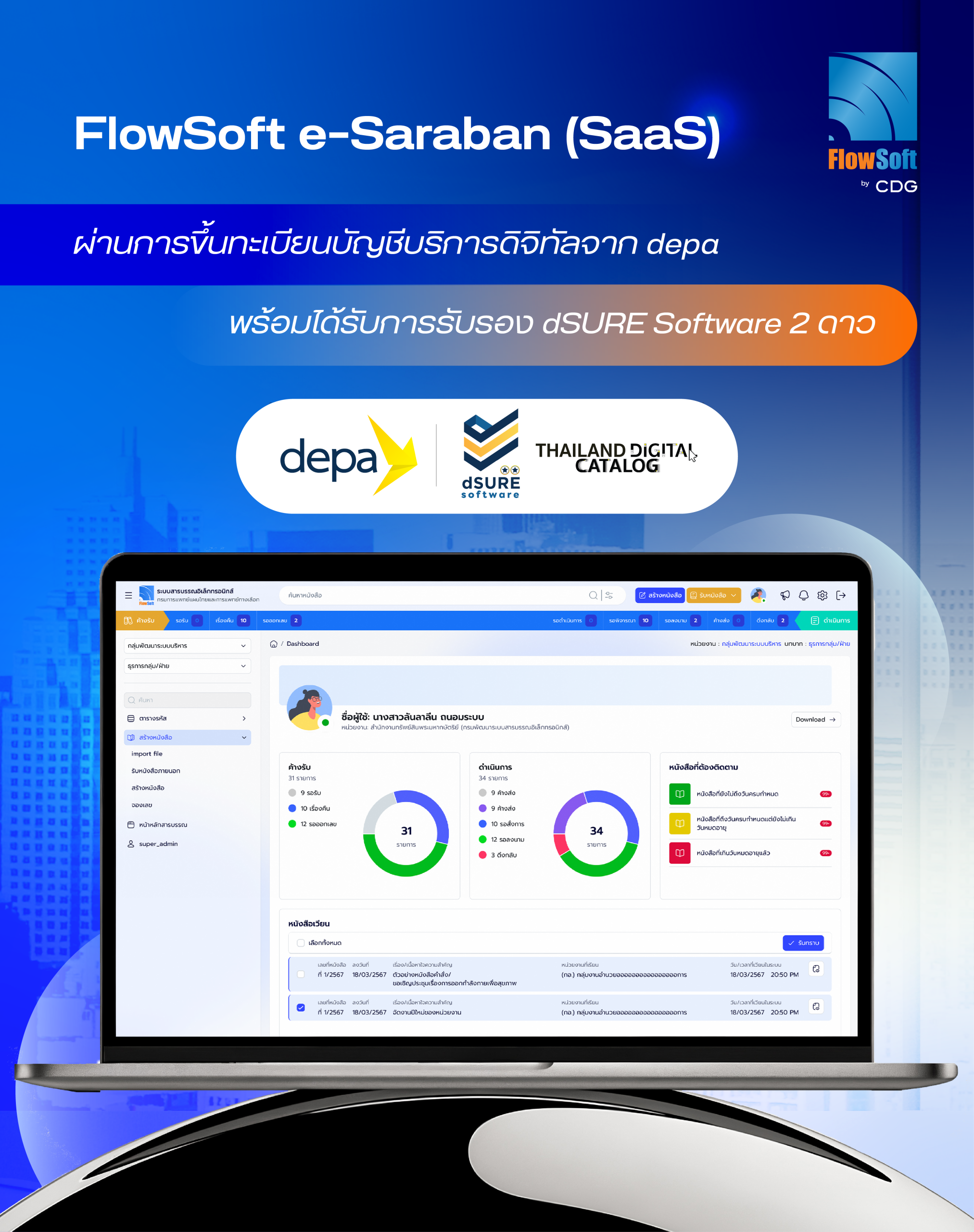 FlowSoft e-Saraban (SaaS) ผ่านการขึ้นทะเบียนบัญชีบริการดิจิทัลจาก depa พร้อมได้รับการรับรอง dSURE Software 2 ดาว